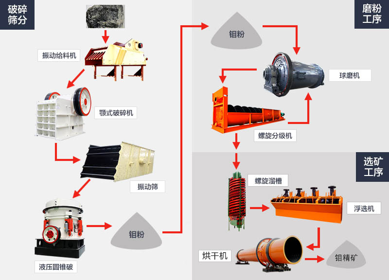 選礦工藝中,我國鉬的選礦方法主要是浮選法。在深選含微量銅的以鉬為主的礦石時,采用了部分混合優(yōu)先浮選的工藝流程?,F(xiàn)在,我國還從銅鉬礦石中選礦回收鉬,常用工藝流程是銅鉬混合浮選,進(jìn)而銅鉬分離和鉬精礦的精選。